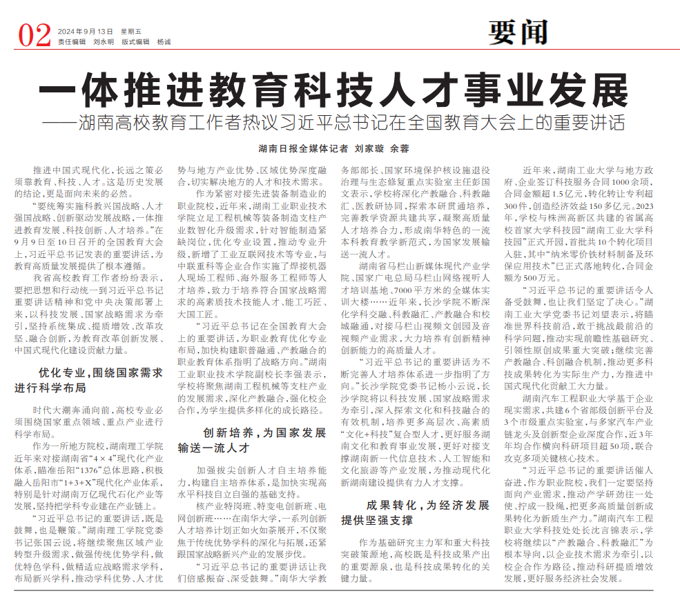 校园网讯 9月9日至10日,全国教育大会在京召开,习近平总书记出席大会并发表重要讲话,强调紧紧围绕立德树人根本任务,朝着建成教育强国战略目标扎实迈进。近期,主要媒体就学习贯彻全国教育大会精神采访了学校党委书记张国云、校长曾祥君。9月13日,《湖南日报》刊发《一体推进教育科技人才事业发展——湖南高校教育工作者热议习近平总书记在全国教育大会上的重要讲话》报道。报道特别指出:作为一所地方院校,BB贝博艾弗森官方网站近...