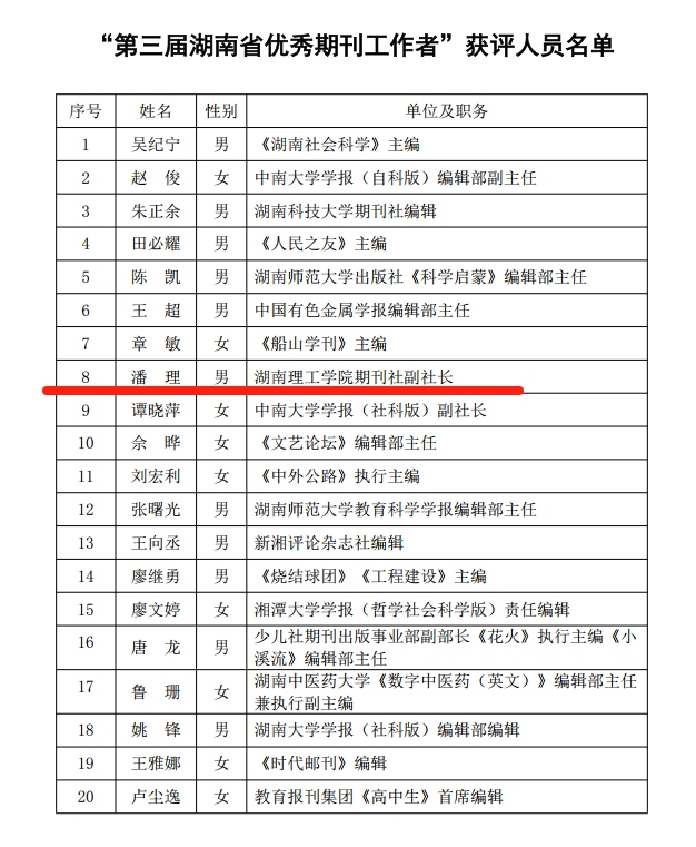 校园网讯近日,湖南省期刊协会公布了第三届“湖南省优秀期刊工作者”评选结果,BB贝博艾弗森官方网站期刊社副社长、《BB贝博艾弗森官方网站学报(自然科学版)》主编潘理教授获奖。潘理教授在担任《BB贝博艾弗森官方网站学报(自然科学版)》主编以后,通过优化审稿流程、强化同行评议、拓展优质稿源等举措,推动该刊物的学术影响力显著提升。该刊物的复合影响因子从2021年的0.351提升至2024年的0.926,2024年先后入选“RCCSE中国准核心学术期刊”、“CA...