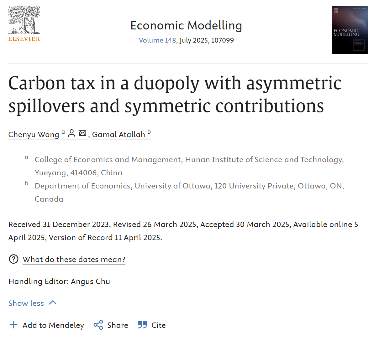校园网讯近日,经济学领域国际权威期刊《Economic Modelling》发表了贝博经济与管理学院青年教师王晨宇博士的学术论文“Carbon tax in a duopoly with asymmetric spillovers and symmetric contributions”。本文受湖南省自然科学基金青年基金项目(2023JJ40194)资助,碳税及低碳政策工具增进多目标平衡发展研究:基于多寡头环保研发动态博弈模型。BB贝博艾弗森官方网站为第一完成单位,王晨宇博士为第一作者和通讯作者,加拿大渥太华...
