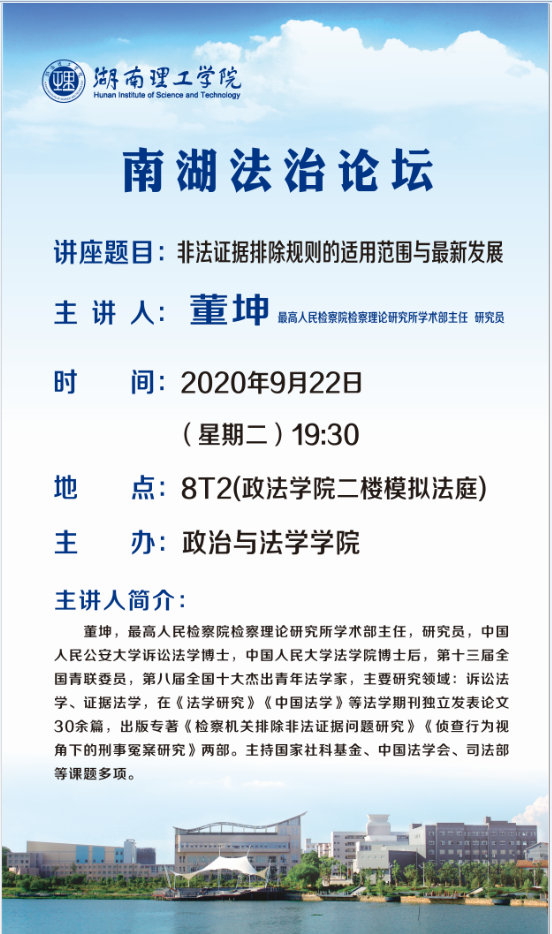 <span>主讲人:</span>董坤(最高人民检察院检察理论研究所学术部主任 研究员)<br/> <span>主题:</span>非法证据排除规则的适用范围与最新发展<br/> <span>时间:</span>2020年9月22日(星期二)19:30<br/> <span>地点:</span>8T2(政法学院二楼模拟法庭)