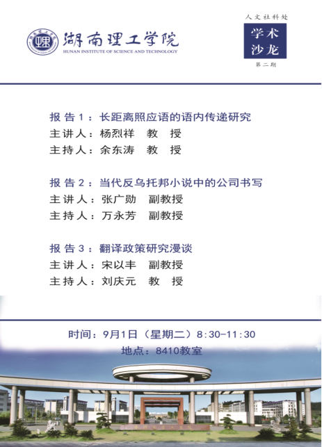 <span>主讲人:</span>杨灿烈 张广勋 宋以丰<br/> <span>主题:</span>《长距离照应语的语内传递研究》、《当代反乌托邦小说中的公司书写》、《翻译政策研究漫谈》<br/> <span>时间:</span>2020年9月1日(星期二)8:30—11:30<br/> <span>地点:</span>BB贝博艾弗森官方网站南院8410教室