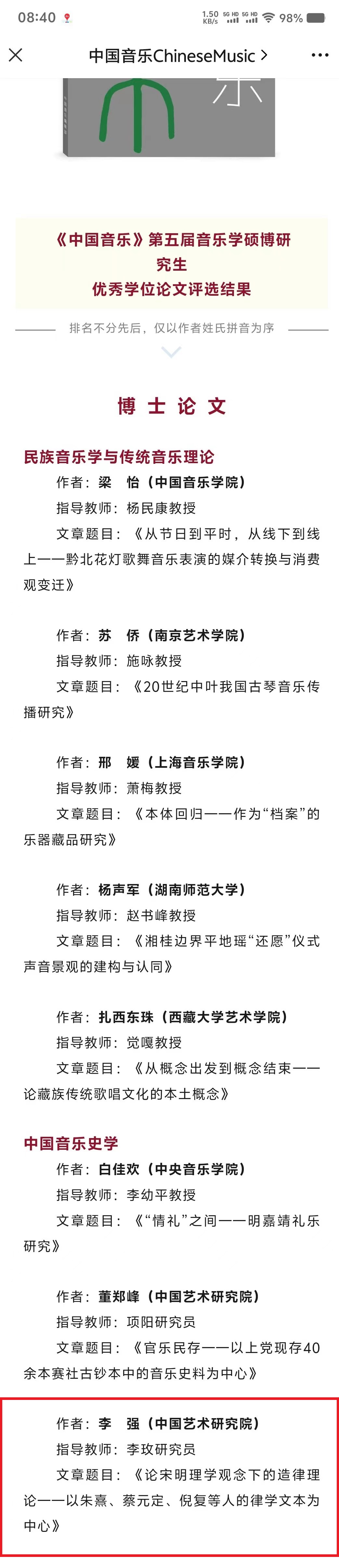 音乐学院李强论文获评《中国音乐》第五届音乐学硕博研究生优秀学位论文