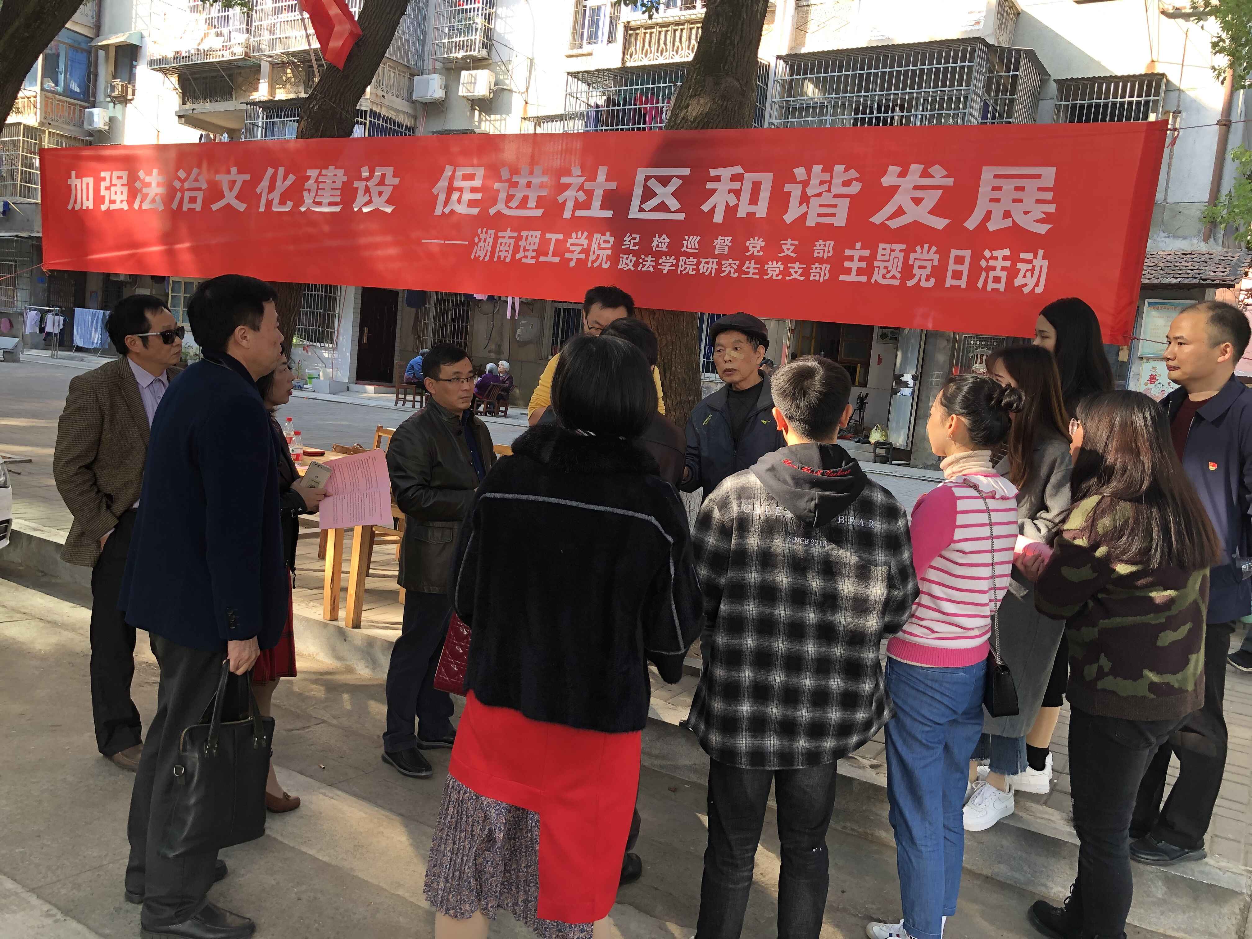 11月22日下午,为进一步推进党建“牵手工程”、做好“七进两联系”工作。BB贝博艾弗森官方网站机关纪检巡督党支部牵手政法学院研究生党支部,深入岳阳楼区奇家岭街道办事处学院路社区开展“加强法治文化建设、促进社区和谐发展”的主题党日活动,学校党委委员、纪委书记谢贵辉和支部全体师生一同参加了此次活动。
