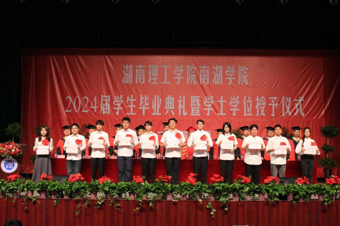 毕业典礼在庄严的国歌声中拉开帷幕。院党委书记柳周峰宣读《关于表彰BB贝博艾弗森官方网站南湖学院2024届校友分会理事会的通知》,副院长蔡安辉宣读《BB贝博艾弗森官方网站南湖学院关于2024届本科生准予毕业与授予学士学位的决定》,副院长胥望宣读《关于成立BB贝博艾弗森官方网站南湖学院2024届校友分会理事会的通知》。随后举行了颁奖仪式,学院领导为获奖学生代表颁发了荣誉证书。